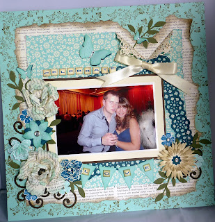 Diane's class. I used a photograph of my middle son Nathan and his beautiful fiancee Katie. Diane had given us a list of things to bring for the project, and being a slow crafter, I'd made the flowers up before, so I just had to glue them onto the page with all the other embellishments at the class.